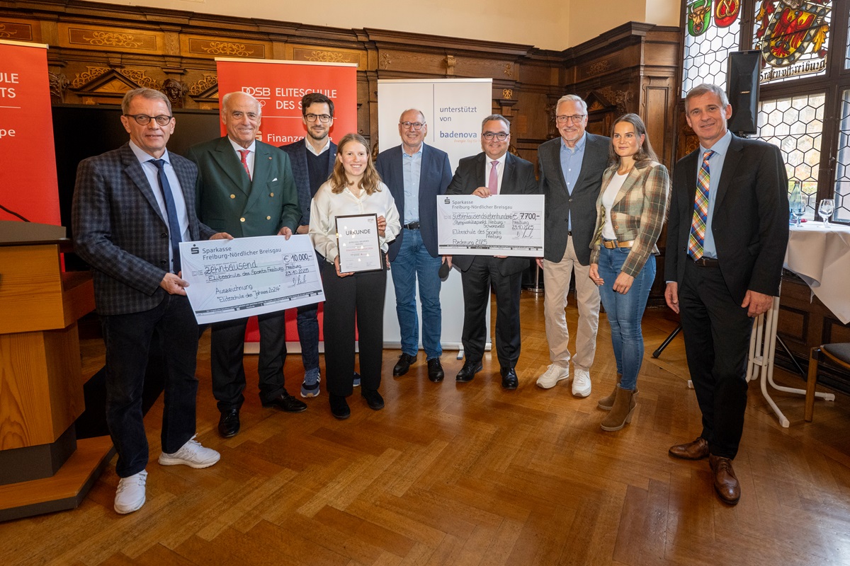 Foto v.l.n.r: Sven Baumgarten (DOSB), Gundolf Fleischer (Vorsitzender des Olympiastützpunktes), Oberbürgermeister Martin Horn, Linn Kazmaier (5-fache Paralympics Medaillengewinnerin 2022 und Internatsschülerin), Jürgen Willrett (OSP-Leiter), Daniel Zeiler (Vorstandsvorsitzender Sparkasse Freiburg-Nördlicher Breisgau), Uli Wiedmann (ehemaliger OSP-Leiter), Bianca Purath (ehemalige Internatssportlerin und jetzt stellvert. Leiterin Sportfördergruppe der BW in Fahl), Ministerialdirektor Daniel Hager-Mann (Kultusministerium).