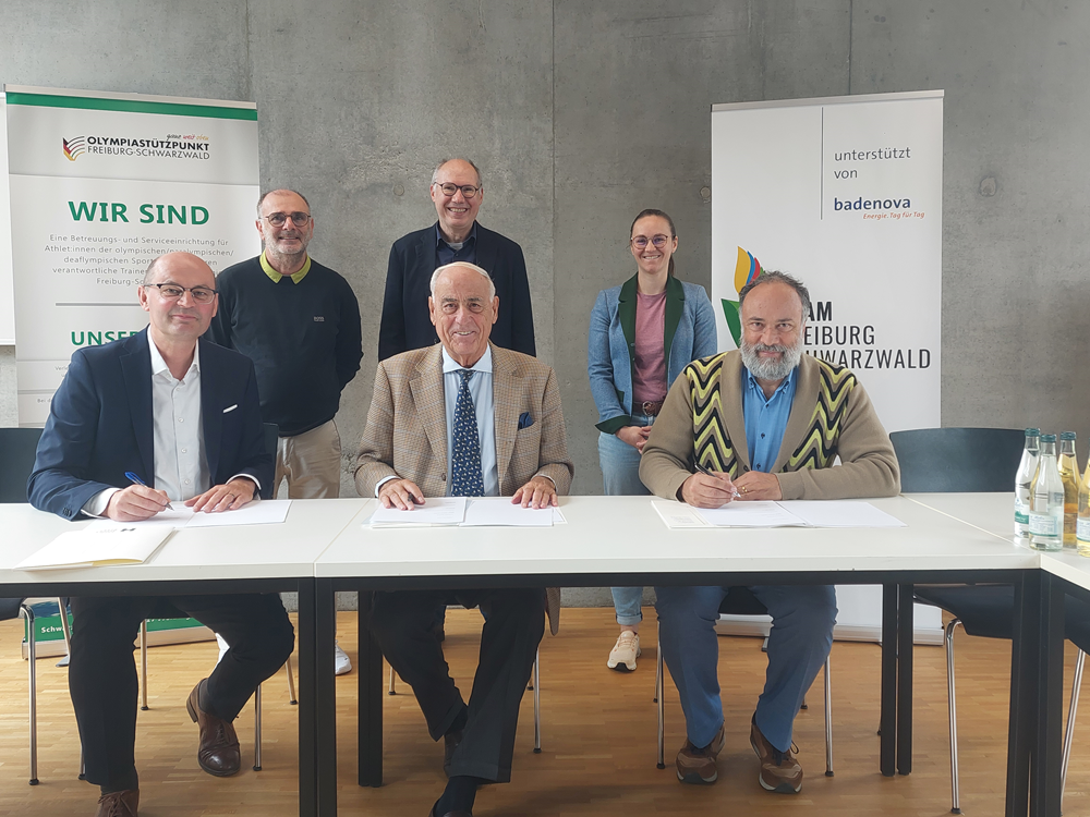 Foto v.l.n.r. hinten: Dr. Walter Rapp (Trainingswissenschaft OSP), Jürgen Willrett (OSP-Leiter), Zsuzsanna Zimanyi (Duale Karriere OSP) Foto v.l.n.r. vorne: Prof. Dr. Stephan Trahasch (Rektor Hochschule Offenburg), Gundolf Fleischer (Vorsitzender des Olympiastützpunkts), Clemens Metz (Geschäftsführer des Studierendenwerks Freiburg)